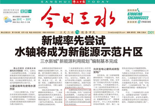 10月14日,佛山日?qǐng)?bào)旗下報(bào)紙《今日三水》在頭版頭條報(bào)道了三水新城新能源利用規(guī)劃的相關(guān)新聞,稱三水新城“新能源利用規(guī)劃”編制已基本完成,將重點(diǎn)發(fā)展太陽(yáng)能光伏發(fā)電和水源熱泵。報(bào)道特別指出,在水源熱泵技術(shù)方面,廣東省目前尚無經(jīng)典案例,三水新城目前已與浙江陸特能源科技有限公司簽訂了框架協(xié)議,在新城利用該技術(shù),并稱陸特公司在水源熱泵應(yīng)用領(lǐng)域擁有成熟的技術(shù)和經(jīng)驗(yàn)。