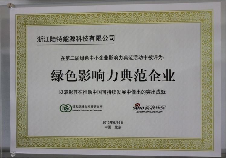 6月6日,第二屆綠色中小企業(yè)影響力典范活動頒獎典禮在北京舉行,陸特能源作為獲獎企業(yè)受邀參加。活動由工業(yè)和信息化信息中心、道和環(huán)境與發(fā)展研究所、新浪環(huán)保頻道聯(lián)合主辦的,是目前國內(nèi)唯一針對綠色中小企業(yè)的公益活動,旨在表彰優(yōu)秀,彰顯綠色中小企業(yè)的影響力。